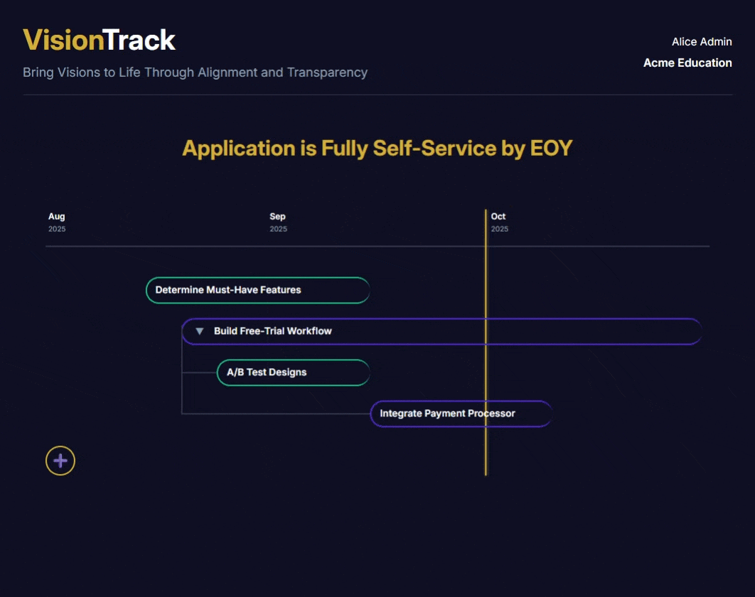 VisionTrack creates a transparent and simple hierarchical roadmap where leaders can drill-down to individual contributor tasks. No more building PowerPoints. No more overly complex roadmapping tools.